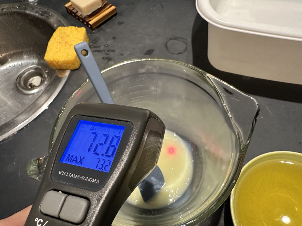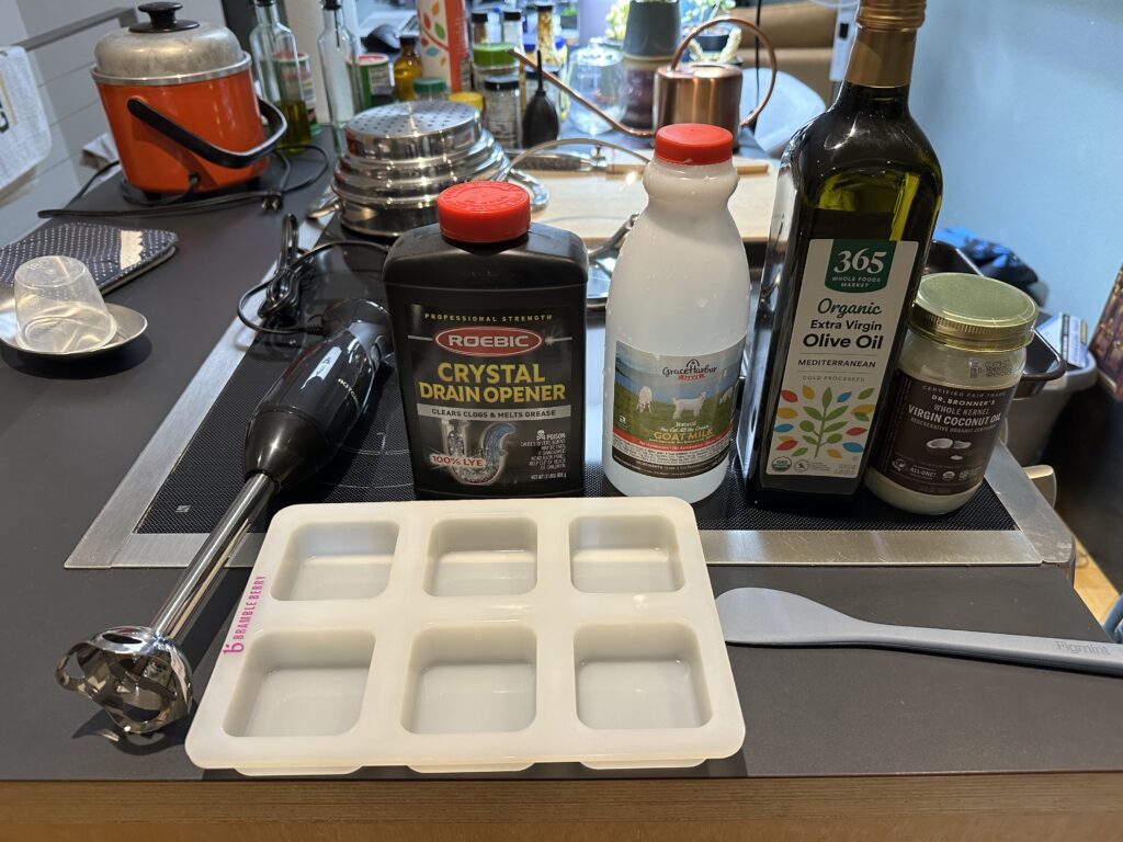 Alongside this trinity are a plethora of other fats, oils, and additives. Milk, particularly goat’s milk, is quite common. Personally, I fully replace water with frozen goat’s milk in my process to make a 100% olive oil soap.