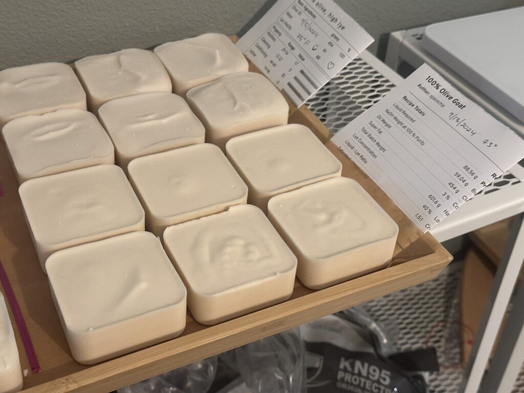 Similar to my other somewhat feminine hobby (plants), soaping requires patience. Even with a 40% lye concentration (this is high), cold-process 100% olive oil soaps needs months to cure.